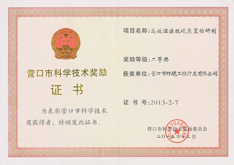 營口市科學技術獎勵證書